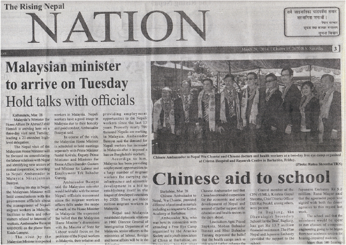 這次活動(dòng)在籌備和組織過程中得到了尼泊爾政府、友好組織與尼泊爾人民的大力支持,首先尼泊爾政府和衛(wèi)生部門為活動(dòng)提供了大量的便利條件,尼泊爾的政界也非常支持這次活動(dòng),尼泊爾主要政黨的領(lǐng)袖,與當(dāng)?shù)卣男姓L(zhǎng)官都參與了這次活動(dòng),并爭(zhēng)先恐后發(fā)表講話。尼泊爾的主要報(bào)紙也在顯著位置進(jìn)行了大量的報(bào)道。認(rèn)為這是中國(guó)人民對(duì)尼泊爾的一次重要幫助,希望中國(guó)的民間組織以后能更多的到尼泊爾來開展活動(dòng),讓尼泊爾老百姓也能因中國(guó)經(jīng)濟(jì)的發(fā)展而得到實(shí)惠。