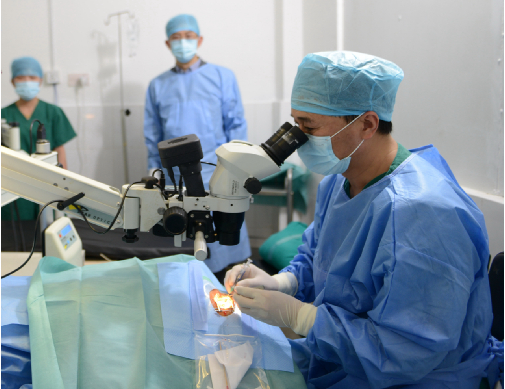姚曉明博士在簡(jiǎn)陋的手術(shù)室里為尼泊爾患者實(shí)施復(fù)明手術(shù)。