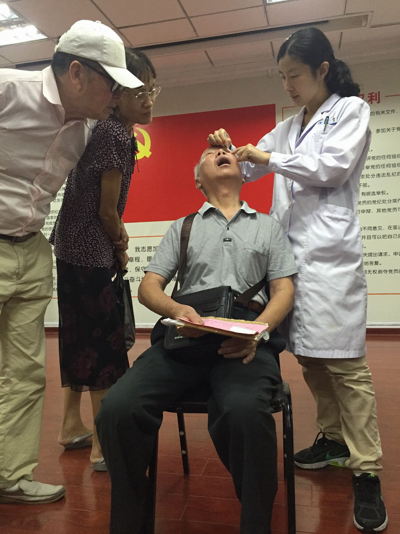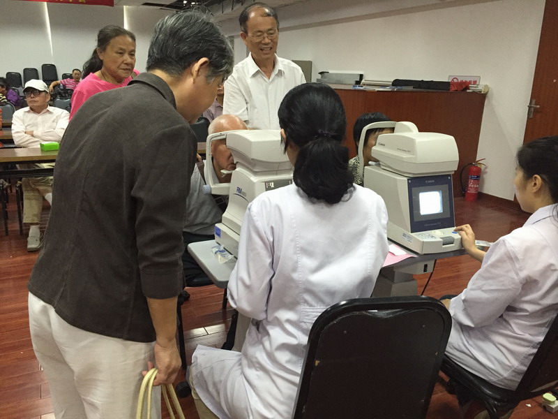 毛祖紅醫(yī)生用裂隙燈現(xiàn)場患者檢查眼壓、驗光