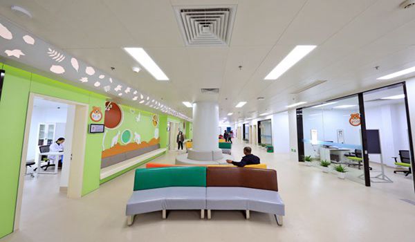 五緣院區(qū)重點(diǎn)開設(shè)白內(nèi)障、青光眼、眼外傷、眼整形、眼底病、視光、斜視與小兒眼科、眼表及角膜病、高度近視等臨床科室,細(xì)分涵蓋了眼科中幾乎所有門類??剖曳謪^(qū)依照關(guān)聯(lián)度排列,相關(guān)性高的科室臨近設(shè)置,以方便患者就診。病區(qū)以溫和明快的暖綠及暖黃為主色調(diào),巧用配色以區(qū)分不同的功能模塊,烘托醫(yī)院溫馨氣氛。病區(qū)設(shè)置階梯型前臺,坐在輪椅上也能與醫(yī)務(wù)人員無障礙溝通。吸聲材料打造走廊壁,以此減少噪音對病患的干擾。五緣院區(qū)還設(shè)計了適合不同年齡層次的休息區(qū),如休閑吧、兒童游樂區(qū)等,稀釋醫(yī)院診所的氛圍,緩解診療時帶來的陌生感和緊張感。
