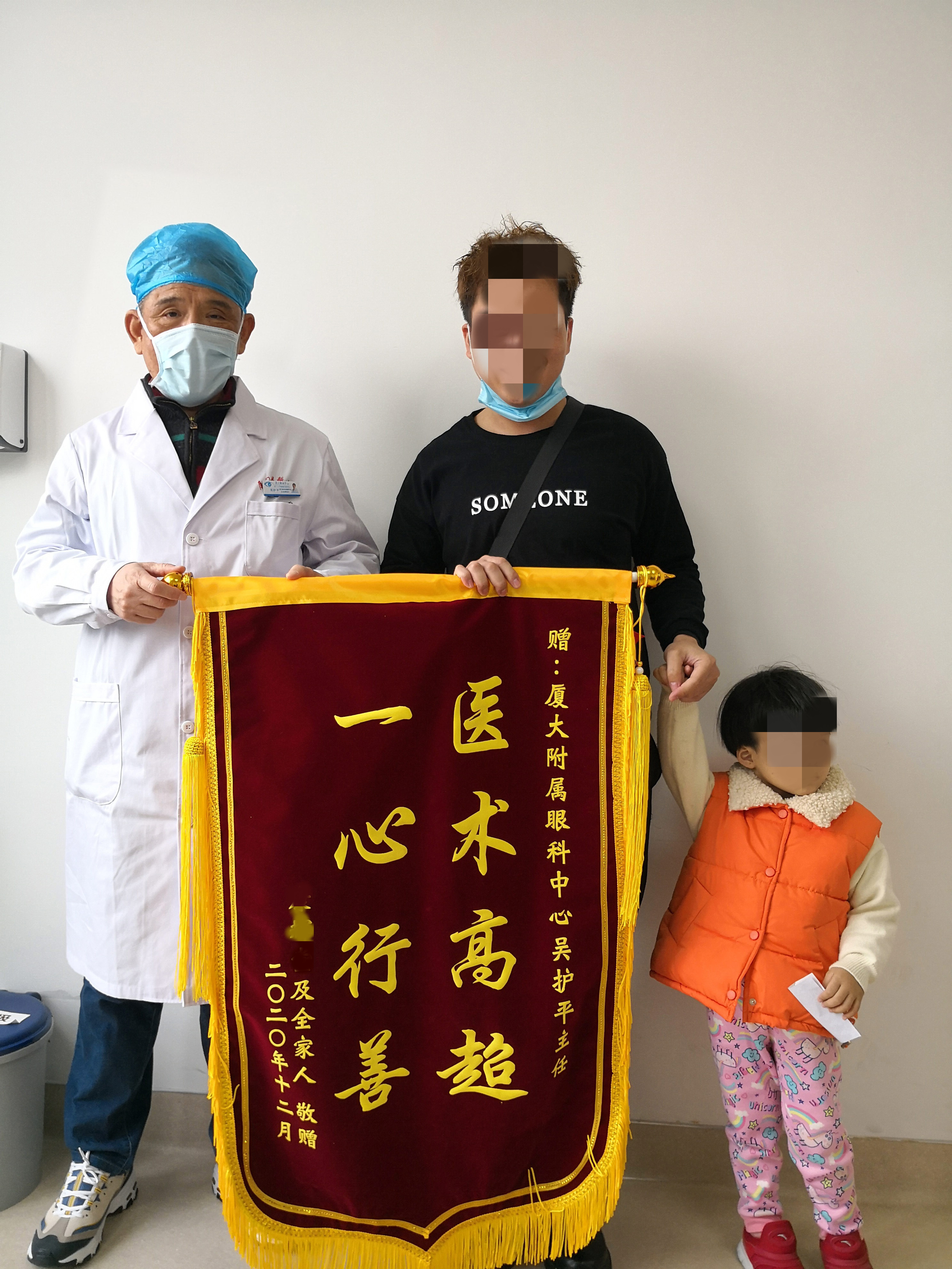 再到復(fù)查的時(shí)候,小可右眼已經(jīng)基本恢復(fù)正常,各項(xiàng)功能都無異樣。小可的爸爸特地為吳護(hù)平教授送來的錦旗,他告訴我們:“孩子沒事了,吳主任救了孩子的眼睛,我實(shí)在太感謝了,在住院那一周,吳主任每次來查房總是特別用心,今天我陪孩子來復(fù)查,想著一定要表達(dá)下我的感謝。”