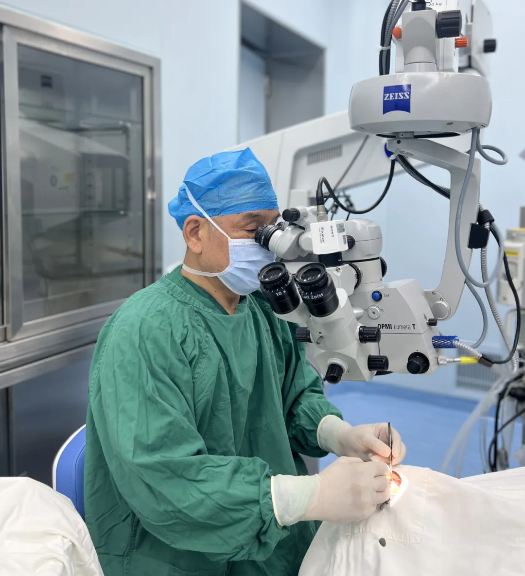 當(dāng)天下午,吳護平院長接診了陳伯伯。經(jīng)過檢查確認(rèn),陳伯伯結(jié)膜有輕微充血,角膜上皮有缺損,角膜上有不規(guī)則灰白色混濁,深度達到基質(zhì)層,視力基本只剩光感,屬于角膜內(nèi)皮營養(yǎng)不良。完善所有的術(shù)前檢查,當(dāng)天傍晚,陳伯伯就進了手術(shù)室,由吳護平院長親自操刀手術(shù)順利完成角膜移植手術(shù)。