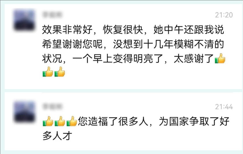 "效果太好了,恢復(fù)特別快!沒(méi)想到十幾年模糊不清的世界,一個(gè)早上就亮了,太感謝了!"