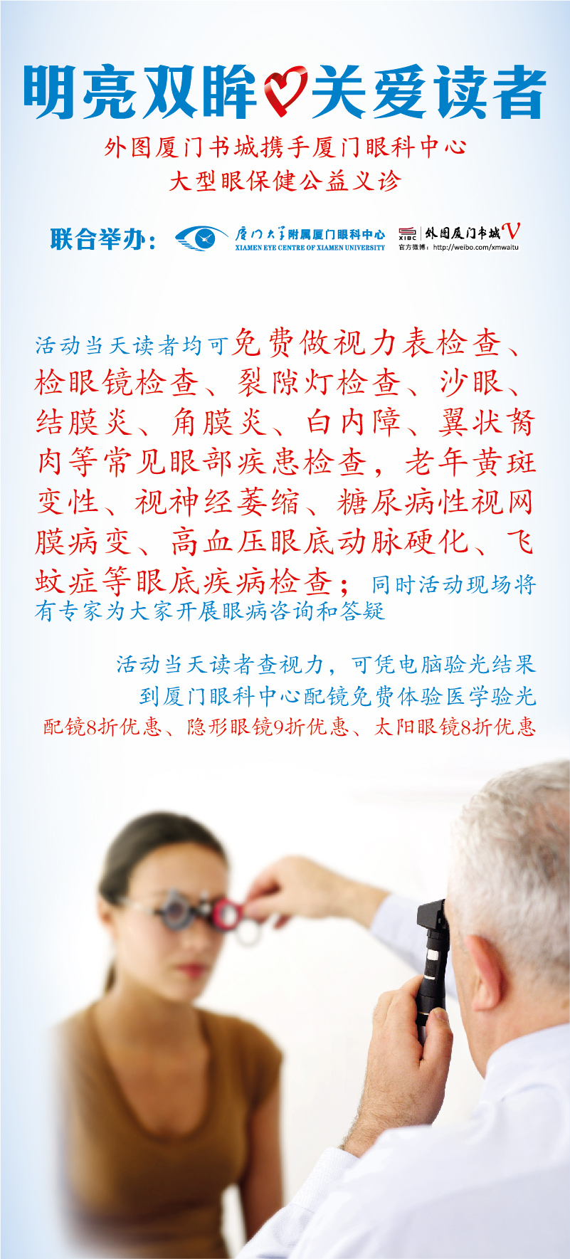 【文章導(dǎo)讀】6月29日(六)9:30-11:30,外圖廈門書城聯(lián)合廈門大學(xué)附屬廈門眼科中心開展明亮雙眸關(guān)愛讀者大型眼保健公益義診,歡迎有需要的讀者參加! 活動當天讀者均可免費做視力表檢查、檢眼鏡