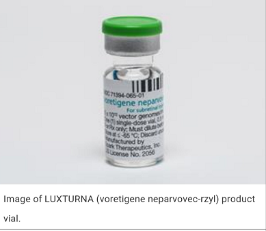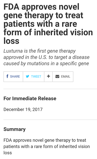 圣誕前夕,從美國(guó)傳來(lái)了重磅消息:“針對(duì)由RPE65基因突變導(dǎo)致的雷柏氏先天性黑朦2型(RPE65基因突變引起)的基因替代療法藥物L(fēng)uxturna(voretigene neparvovec-rzyl)獲FDA批準(zhǔn)上市!失明患者重見光明為時(shí)不遠(yuǎn)!