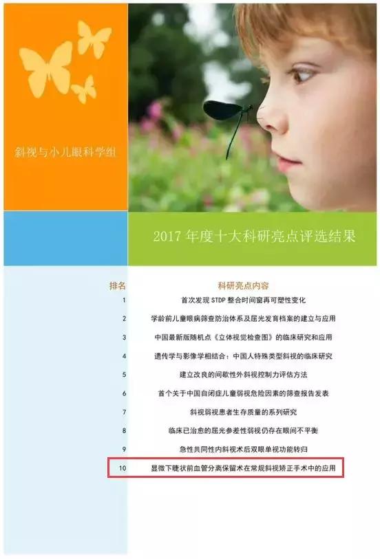 日前,由我院潘美華教授領銜的項目“顯微下睫狀前血管分離保留術在常規(guī)斜視矯正手術中的應用”成功入選中華醫(yī)學會斜視與小兒眼科學組“2017年十大科研亮點”。