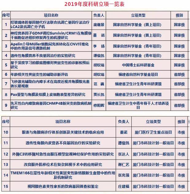 2019年全院發(fā)表SCI文章12篇,核心期刊文章31篇;5項(xiàng)專利獲得授權(quán);出版專著5部;在全國眼科年會(huì)投稿309篇,省級以上學(xué)術(shù)會(huì)議發(fā)言41人次。