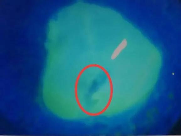 老楊右眼術(shù)前熒光造影照片—紅色圓圈中黑色區(qū)域?yàn)榻悄ご┛椎牟糠?/div>