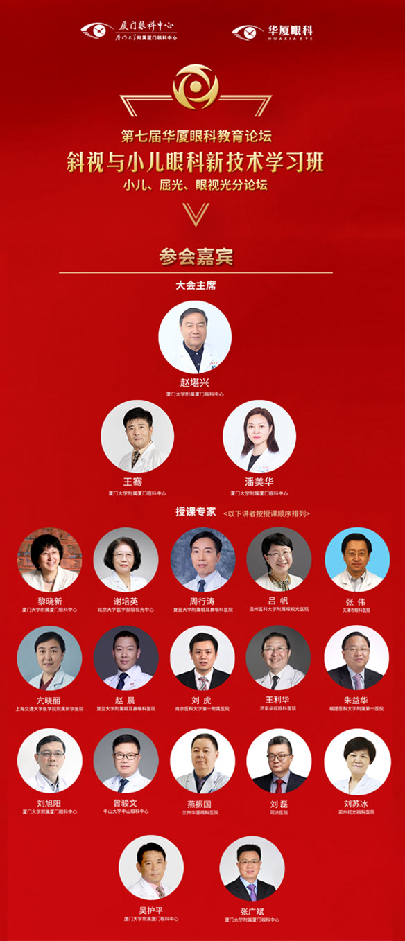 巔峰聚首,百家爭鳴!10月18日-21日,由廈門大學(xué)附屬廈門眼科中心主辦的“斜視與小兒眼科新技術(shù)學(xué)習(xí)班暨第七屆華廈眼科教育論壇小兒、屈光、眼視光分論壇”云端際會,精彩盛放。本屆論壇由47名大咖學(xué)者領(lǐng)銜主講,匯集國內(nèi)眼科領(lǐng)域金字塔尖專家,為我們帶來智慧激蕩的高峰論劍。大會主席:國際眼科科學(xué)院院士、華廈眼科醫(yī)院集團(tuán)專家委員會主席趙堪興教授,廈門眼科中心業(yè)務(wù)院長、華廈眼科醫(yī)院集團(tuán)副總院長王騫教授,廈門眼科中心業(yè)務(wù)副院長、斜視與小兒眼科科主任潘美華教授共同擔(dān)任。