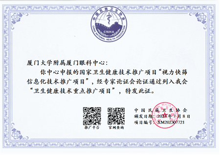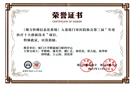 11月25日,在廈門市醫(yī)院協(xié)會第三屆年會暨“學科引領(lǐng)高質(zhì)量發(fā)展”學術(shù)會議上,廈門大學附屬廈門眼科中心“視力快篩信息化系統(tǒng)”榮獲廈門市醫(yī)院協(xié)會第三屆“年度醫(yī)療十大創(chuàng)新技術(shù)”項目,同時“視力快篩信息化技術(shù)推廣項目”經(jīng)國家衛(wèi)生健康技術(shù)應(yīng)用推廣項目專家論證會論證,成功入選中國民族衛(wèi)生協(xié)會2023年度“衛(wèi)生健康技術(shù)重點推廣項目”。